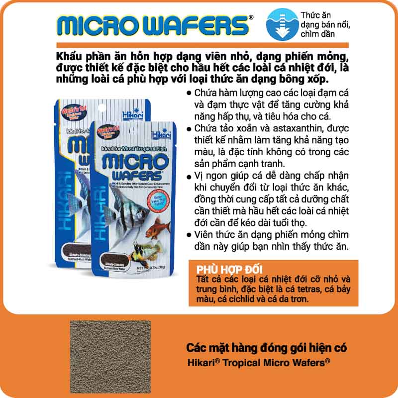 Hikari Tropical MICRO WAFERS phù hợp với tất cả các loại cá torpical cỡ vừa và nhỏ để tạo ra màu sắc vượt trội.