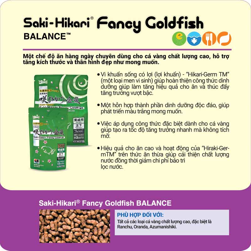 Saki-Hikari Fancy Goldfish Balance giúp tăng cường màu sắc với đặc tính tăng trưởng, chế độ ăn hàng ngày cao cấp cho cá Vàng. Tác nhân lợi khuẩn là “vi khuẩn sống” hoạt động trong ruột giống như bifidobacteria trong sữa chua, và “Saki Hikari” chứa một lượng lớn vi khuẩn Hikari (một loại trực khuẩn). Vi khuẩn Hikari sống trong ruột và phân hủy ngũ cốc thành dạng dễ tiêu hóa.