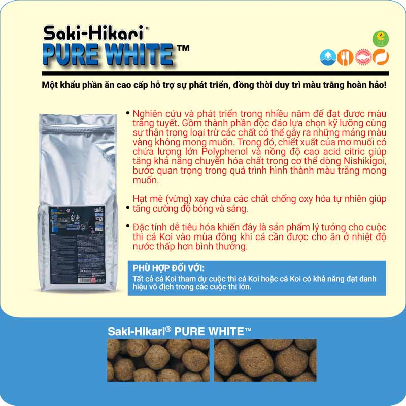 Saki Hikari Pure White là một loại thức ăn cá Koi đặc biệt được sản xuất bởi Hikari, một trong những thương hiệu hàng đầu trong ngành công nghiệp thức ăn cho cá cảnh. Đây là một sản phẩm nổi tiếng được thiết kế để cung cấp chế độ dinh dưỡng tối ưu cho cá và đặc biệt là để tăng cường màu trắng của cá. Dưới đây là một số đặc điểm nổi bật và thông tin chi tiết về Saki Hikari Pure White: